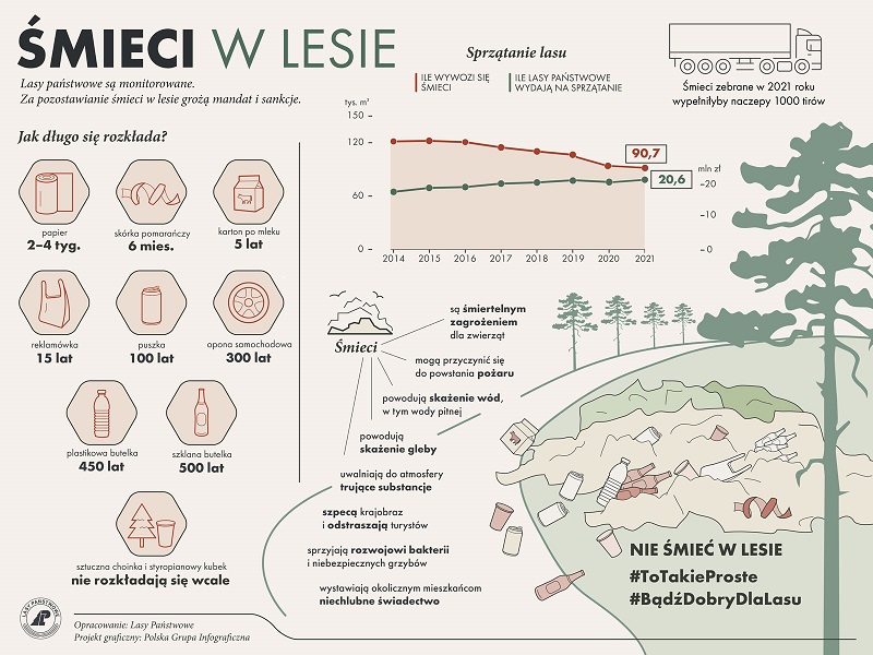 Śmieci w lasach to problem nie tylko estetyczny. Odpady na terenach leśnych to często pułapki dla drobnych zwierząt, szczególnie dla owadów. Wabią je resztki pokarmów i napoi. Lasy Państwowe wkładają ogromny wysiłek w usuwanie śmieci z lasów. Każdego roku ich uprzątnięcie kosztuje kilkanaście milionów złotych. W ostatnich latach na ten cel wydawane jest ok. 20 mln zł. Co roku z lasów wywozi się średnio 110 tys. m3 śmieci.